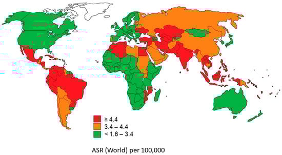 Estimated ASR (age-standardized mortality rates) World in 2018, all cancers, both sexes, age 0–19. Based on the International Agency for Research on Cancer, “Global Cancer Observatory.” https://gco.iarc.fr/ [13].