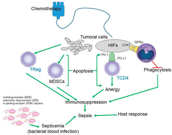 Immunosuppression associated with infection becomes more critical if it is due to a multidrug-resistant (MDR) or extensively drug-resistant (XDR) bacterium, and it results in a worse prognosis if it is due to pandrug-resistant (PDR) bacteria. The immunosuppression observed in cancer patients represents an important risk factor for developing sepsis, leading to higher mortality rates and higher costs for the healthcare sector.