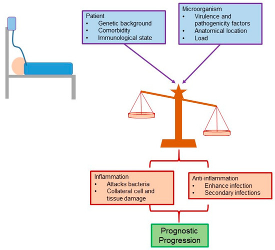 For a long time, the main cause of the clinical picture presented during sepsis (systemic inflammatory response syndrome, SIRS) was attributed to the excessive inflammatory response. However, recent evidence points to the fact that the clinical characteristics and the pathophysiology of sepsis are multifactorial in nature, and the intrinsic characteristics of the patient (e.g., comorbidity) and their genetic load should also be considered. In this way, the characteristics of the microorganism(s) involved, such as the bacterial load and the factors of pathogenicity and virulence, also influence this disease (Figure 3) [37].