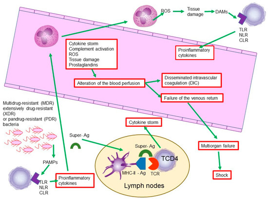 The tissue damage and the alteration of the blood perfusion leads to the failure of the venous return, which generates multiorgan failure, contributing to a worse prognosis of the state of sepsis that dangerously derives the state of shock (Figure 4) [42,43].