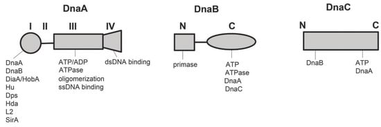 - Seitz, H.; Weigel, C.; Messer, W. The interaction domains of the DnaA and DnaB replication proteins of Escherichia coli. Mol. Microbiol. 2000, 37, 1270–1279. [Google Scholar] [CrossRef] [PubMed]