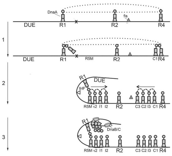 - Ryan, V.T.; Grimwade, J.E.; Camara, J.E.; Crooke, E.; Leonard, A.C. Escherichia coli prereplication complex assembly is regulated by dynamic interplay among Fis, IHF and DnaA. Mol. Microbiol. 2004, 51, 1347–1359. [Google Scholar] [CrossRef] [PubMed]