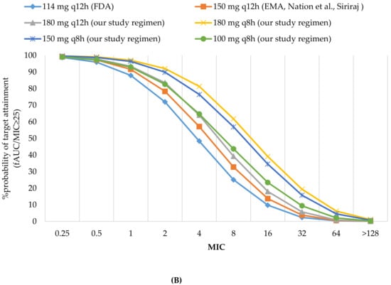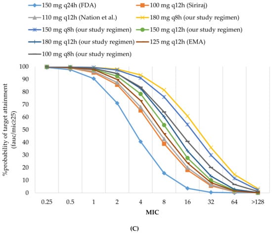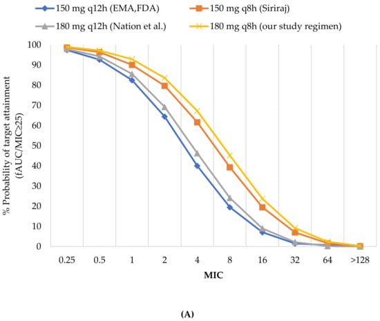 The FDA-approved regimens have shown lower target attainment rates than other regimens. Similarly, the studies from Nation et al. [12,16] showed that FDA-approved regimens were substaintially lower than those approved by the EMA. The data has also shown that patients with renal impairment have a better chance to achieve PTA target compared with normal renal function. The findings of our study were consistent with previous analyses, the dosing suggestions of Nation et al. achieved 80–90% of patients in each of 3 groups of creatinine clearance patients (50 to <80, 30 to <50, <30 mL/min). At creatinine clearance ≥ 80 mL/min, the suggested doses only provided <40% PTA for plasma colistin Css, avg of 2 mcg/mL [12]. Additionally, renal function significantly impacts upon the proportion of colistimethate for conversion to colistin due to colistimethate being predominately renally excreted by with only small fraction of the dose converted to colistin [9,22,23].