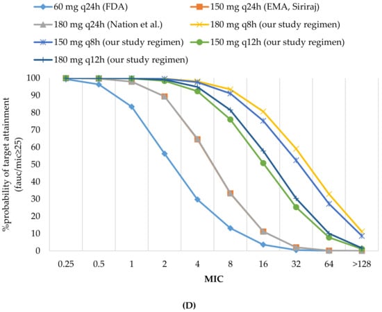 The pharmacodynamic (PD) surrogate indices for colistin are characterized by area under the unbound colistin plasma concentration-time curve to the minimum inhibitory concentration (fAUC/MIC) [13,14]. PK/PD targets were defined as fAUC/MIC ≥25 [13]. The trapezoidal rule was used to calculate AUC, then fAUC was divided by the MIC to obtain the value for the desired PK/PD index. A colistin unbound fraction of 50% was used [15]. The regimen administrated using IV infusions (infused over 30 min) were simulated over a 24-h period at different levels of renal function. The ranges of creatinine clearance (CrCl) used were ≥80, 51 to 79, 30 to 50, 11 to 29 and ≤10 mL/min. The other dose was shown in Supplementary Materials Table S1.