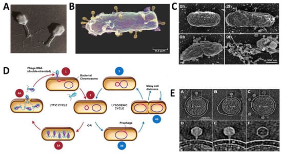 Introduction to lytic phage biology. (A) Shadowed Transition Electron Micrograph image of T4 phage (Mag 380,000×). This phage, a member in the Myoviridae family of the Caudovirales order, is one of the seven Escherichia coli phages (T1–T7) in this family. This image shows the icosahedral capsid head containing the genetic material, the contractile tail, and the long tail fibers of the phage. T4 head is approximately 90 nm, wide and the virion is 200 nm in length. This TEM was photographed at Wurtzbiozentrum at the University of Basel, reproduced with permission from references [42,43]. (B) Colorized scanning electron micrograph (SEM) images of multiple T4 bacteriophages infecting an E. coli cell reproduced with permission from reference [44]. (C) SEM images at different stages showing the infection of Synechococcus WH8102 by the S-TIM5 phage. 0 h-uninfected cells. 2 h-phage adsorption. 9-h cell lysis. 9-h viral release. These SEM images were collected from Sabehi. G., from the Israel Institute of Technology, reproduced with permission from reference [45]. (D) The lytic and lysogenic infection cycles. The first two stages are shared for both the cycles. Step 1- Attachment of the phage tail fibers to a specific receptor site on the bacterial cell wall and injection of the viral genome. Step 2- Phage DNA is then circularized and enters the lytic cycle or the lysogenic cycle. Lytic cycle: Step 3A- Synthesis of new viral proteins within the host. Step 4A- Virions are liberated as mature phages upon cell lysis. Lysogenic cycle: Step 3B- Phage DNA integrates within the bacterial chromosome by recombination, in turn becoming a prophage. Step 4B- Lysogenic bacterium reproduces normally and has the potential to do so over many cell divisions. The prophage may be released from the bacterial chromosome through external triggers, resulting in the initiation of the lytic cycle—reproduced with permission from reference [30]. (E) T7 bacteriophage infecting E. coli as seen with cryoelectron tomography at ~4 nm resolution. A/D- Adsorption of T7 phage into the outer membrane. B/E- Injection of the extended tail into the cell envelope. C/F- DNA ejection. These images are collected from Bo Hu, University of Texas—reproduced with permission from reference [31].