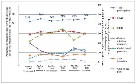 Seasonal variations were observed in both the frequency of the complaints reported by the patients and the corresponding antibiotic prescribing (Table S1 and Figure 1). The peak of antibiotic prescribing was observed during the monsoon seasons: both monsoon seasons (76%) (Table 1 and Figure 1). Significant seasonal variations were observed in antibiotic prescription rates for URTIs and gastro-intestinal disorders, and peaks were noted during winter and the first pre-monsoon season, respectively (Figure 1).
