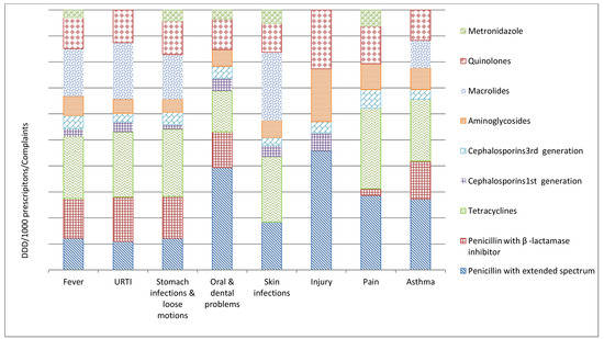 Descriptive statistics were calculated for the total number of prescriptions collected and their distribution according to the age and sex of the patient and the season. The IHCPs were asked to write down all presenting complaints for a given patient. The presence of single or multiple presenting complaints/diagnoses provided a large matrix of prescription patterns. We got 323 different combinations of complaints. To simplify the analysis of antibiotic prescription patterns, presenting complaints were arranged in a descending order of frequency for one, two, and more than two presenting complaints. Antibiotic prescription patterns for different combinations of presenting complaints were explored and analyzed. Prescription patterns were presented in the results, if the frequency of the presenting complaint was higher than 100. Because the IHCPs prescribed antibiotics under both generic and trade names, all the trade names of antibiotics were manually converted to their generic names. Each prescribed antibiotic was coded according to the World Health Organization (WHO) Collaborating Centre for Drug Statistics Methodology, Anatomical Therapeutic Chemical (ATC) classification with the DDD, according to the fifth level of the ATC classification, J01 (antibacterial for systemic use) [36]. All DDDs were calculated per thousand prescriptions per presenting complaint/diagnosis (TPP) or a combination of presenting complaints/diagnoses (DDD/TPP) [23,37,38,39,40,41]. FDC were assigned DDDs based on the average use of combinations, without considering and comparing the strengths of various components [36]. Prescription patterns were examined in three age groups (≤5, 6–17, and ≥18 years) and over four seasons. Seasons were divided as follows: pre-monsoon season (March to May), monsoon season (June to September), post-monsoon season (October to December), and winter season (January and February), with average maximum temperatures of 35 °C–40 °C, 29 °C–31 °C, 27 °C–31 °C, and 20 °C–24 °C, respectively [42]. Because data were collected over 18 months (April 2015 to September 2016), the study covered six seasons (two pre-monsoons, two monsoons, one post-monsoon, and one winter). Proportions with their 95% CI were calculated. The frequency and percentage were calculated for categorical variables and the median and inter quartile range were calculated for continuous (numerical) variables.