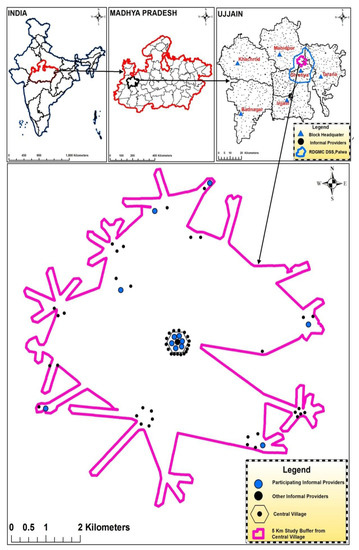 This repeated cross-sectional study was conducted in the Ujjain district of the state of Madhya Pradesh (MP), India. MP has a low human development index of 0.624 [33]. It is the fifth largest state in India in terms of population, and approximately 75% of its population resides in the rural area [34]. Specifically, the study was conducted in the rural demographic surveillance site (DSS), Palwa, of RD Gardi Medical College, Ujjain, which caters to 60 villages in three development blocks (Figure 3) [35]. The populations of each of the 60 DSS villages’ ranges from 800 to 2500, and approximately 50% of the villages have a population of less than 1000 inhabitants. Most (80%) of the healthcare providers in the DSS, both formal and informal, are concentrated in one village, known as the central village (Figure 3).