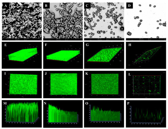 For visualization of biofilm formation in S. aureus, biofilms of representative S. aureus isolates were further investigated by scanning electron microscope (SEM) and confocal laser scanning microscopy (CLSM) (Figure 1). The biofilm formation ability is presented in Figure 1. Biofilms grown on the coverslip conglomerated in thick, heterogeneous and multiple layers with columnar clusters were observed in SA-134, which was high-biofilm producer (Figure 1A,E,I,M). Biofilms clustered into a honeycomb structure were observed in SA-135, which was medium-biofilm producer (Figure 1B,F,J,N). By contrast, the SA-136 isolate of low biofilm-producer exhibited lower degree of staining and showed more dispersed (Figure 1C,G,K,O). Almost all cells of the SA-137 isolate showed a single-cell distribution, which was non-biofilm producer (Figure 1D,H,L,P).