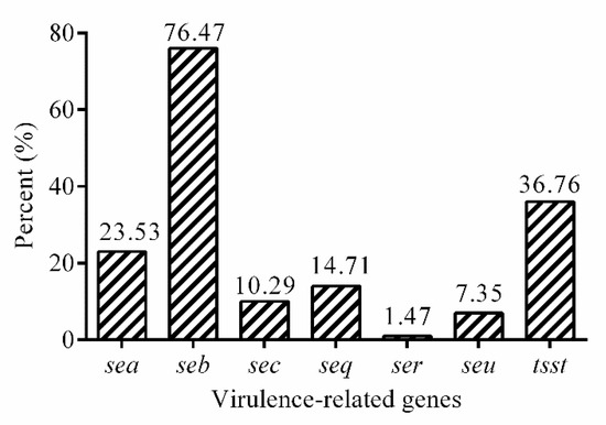 The prevalence of virulence-related genes was shown in Figure 3. Of the virulence genes investigated, the three most frequently detected virulence genes were seb (50.00%, 34/68), tsst (36.76%, 25/68), and sea (23.52%, 16/68). The prevalence of the other virulence genes was as follows: seq (14.70%, 10/68), sec (10.29%, 7/68) and seu (7.35%, 5/68), and ser (1.47%, 1/68). However, genes of sed, see, seg, seh, sei, sej, sek, sel, sem, sen, and seo were not detected in isolates studied here.