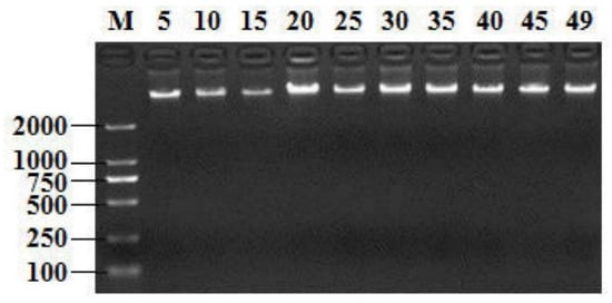 Partial electropherogram result of genomic DNA of isolated strains. M: DNA Maker DL2000; Lanes 5–49: DNA bands of 10 isolated strains.