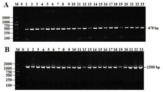 The PCR (polymerase chain reaction) results of the screened T. halophilus strains. (A) The screened T. halophilus strains by amplification of groEL gene; Lane M: DNA Marker DL2000; Lane 0: negative; Lane 1–23: Candidate strain of T. halophilus; (B) Electrophoresis of amplification product; Lane M: DNA Maker; Lane 0: Negative control; Lanes 1–23: The band of PCR amplification products of DNA primer PCR.