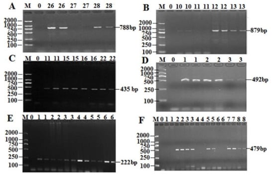 PCR detection results of some T. halophilus resistance genes. (A) blaTEM gene; (B) GyrB gene; (C) SulII gene; (D) EmgrB gene; (E) acrB gene; (F) aadA1 gene; M: DL2000Marker, 0: Negative control.
