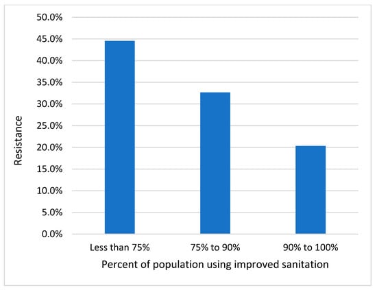 Poor controls on the spread of bacteria facilitate the spread of resistant bacteria and also will facilitate the opportunity for resistance genes to insert into other bacteria. On a worldwide basis, contaminated water is likely to be the main transmission pathway. Figure 2 shows high levels of resistance in countries with poor sanitation, and these high rates of resistance persist even though these countries have low levels of antibiotic usage [15].