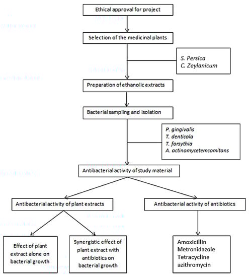 An in vitro experimental design was adopted to conduct the study. Ethical clearance was obtained after review and evaluation from the Ethical Review Committee of the institution (King Khalid University, SRC/ETH/2016). Raw plant product (twig of S. presica and inner bark of C. zeylanicum) was obtained from the herbal garden and native market in Saudi Arabia. Specimens were identified and confirmed by a taxonomist and a pharmacognosist for their authenticity. The plant specimens were submitted to the herbarium of the biology department to obtain the voucher number as follows (S. presica #43567 and C. zeylanicum #47657). Different antibiotics [metronidazole (lot #34399-42029), amoxicillin (lot #33404-38095), azithromycin (lot #33487-3994), and tetracycline (lot #22363-43393); Research Product International, Mt Prospect, IL, USA] were used in combination with the different plant extracts, to evaluate the existence of a synergistic effects (Figure 1).