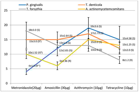 Antibacterial activity of antibiotics against periodontal pathobionts. ∞ = Resistant; € = Sensitive; ¥ = Intermediate sensitive.