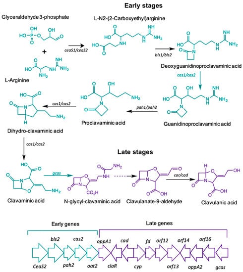 The biosynthetic pathway leading to CA starts with the condensation of the amino acid L-arginine (precursor C5), and the glycolytic intermediate glyceraldehyde-3-phosphate (GAP), (precursor C3). The reaction is mediated by N2-(2-carboxyethyl)-arginine synthetase (CeaS) producing the acyclic compound N2-(2-carboxyethyl) arginine, which, after successive oxidation-reduction reactions, gives rise to clavaminic acid, which differs from CA in its stereochemistry [3]. The conversion of clavaminic acid to CA requires the inversion of the stereochemistry of the ring system to form CA. The structural similarities between CA and 5S clavams reflect shared elements of a common biosynthetic pathway. The steps shared in the biosynthetic pathways are called "early stages", which lead to the last common intermediate, clavaminic acid. The specific stages, used for the production of CA or 5S clavams, are called "late stages" (Figure 1) [4].