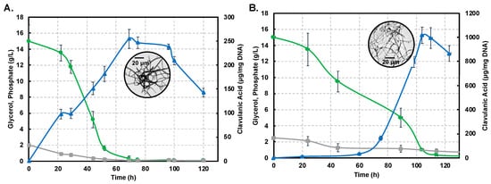 Figure 2A,B show profiles for substrate consumption and product biosynthesis using the S. clavuligerus ATCC27064 strain, grown in minimal GSPG and soybean-based SB-M media, respectively.
