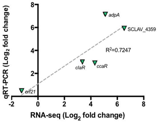 Quantitative real time PCR for selected genes orf21, ccaR, adpA and SCLAV_4359. Correlation between RNA-Seq experiment and qRT-PCR. The dashed gray line represents the least squares adjustment for the data points shown.
