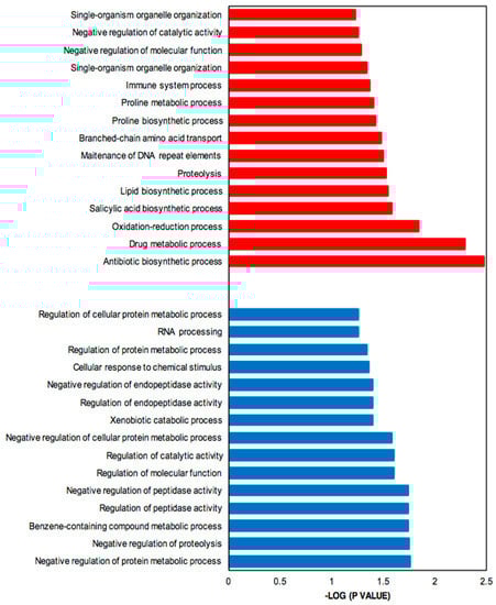 Bar plot for the −log10 of the p-value of selected GO terms (biological process). The up- and down-regulated genes (q-value (FDR) threshold) were subjected to gene ontology analysis using Ontologizer 2.0. The enriched biological processes were plotted. Red bar, enriched GO terms regulated by up-regulated genes; blue bar, enriched GO terms regulated by down-regulated genes.