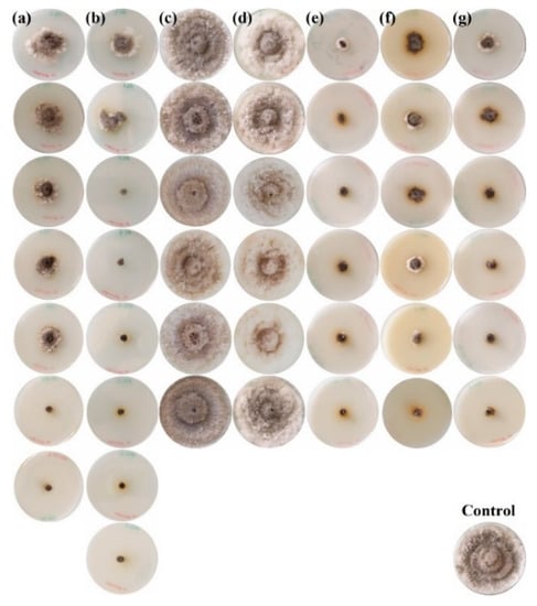 N. parvum mycelial growth inhibition assays for: (a) chitosan oligomers; (b) ε-polylysine; (c) S. rochei secondary metabolites; (d) S. lavendofoliae secondary metabolites; (e) ε-polylysine:chitosan (1:1 w/w) conjugates; (f) S. rochei secondary metabolites + chitosan oligomers (1:1 w/w); and (g) S. lavendofoliae secondary metabolites + chitosan oligomers (1:1 w/w). The concentration of the treatments decreases from top to bottom (doses for each treatment are indicated in Table 3). The petri dish in the bottom right corner shows the PDA control. Only one replicate per each treatment and dose is shown.