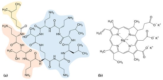(a) The chemical structure of colistin is composed of three parts: a hydrophobic fatty-acyl tail (yellow), a linear tripeptide segment (orange), and a hydrophilic, heptapeptide ring (blue); (b) Chemical structure of chlorophyllin. A combination of both components was used to control Gram-negative bacteria.