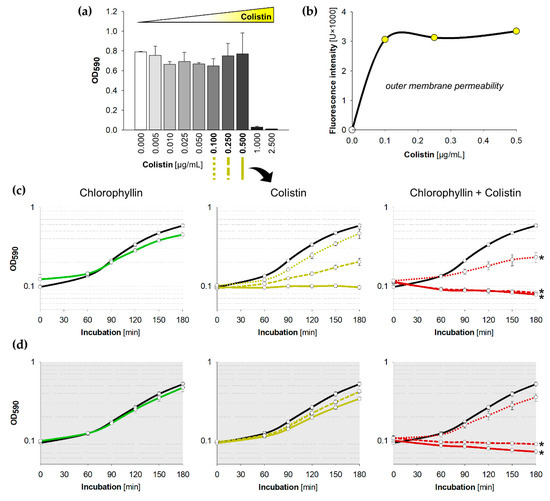 Influence of colistin and chlorophyllin on the growth of Escherichia coli DH5α; (a) Growth status of E. coli cultures in lysogeny broth (LB) supplemented with different colistin concentrations after 24 h incubation at 37 °C; (b) outer membrane permeability of E. coli in the presence of different colistin concentrations determined by using the NPN uptake assay; (c,d) Growth pattern of E. coli in the presence of 10 mg/L chlorophyllin (green line, first column), colistin (yellow lines, central column) and of a combination of both substances (red lines, right column). The black lines describe growth in LB without any supplementation; (c) cells were illuminated with a light intensity of 12 mW/cm2; (d) cells were incubated in dark. In columns two and three, dotted lines describe growth pattern of cultures in LB + 0.10 µg/mL colistin, dashed lines growth pattern of cultures in LB + 0.25 µg/mL colistin, and solid lines growth pattern of cultures in LB + 0.5 µg/mL colistin. Depicted are measured values (circles) and fitted curves (lines) ± standard deviations (n = 3) showing one representative of three independent experiments. *: p < 0.05 vs. chlorophyllin-free samples.