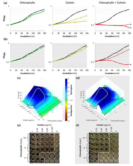 (a,b) Growth pattern of E. coli in the presence of 5 mg/L chlorophyllin (green line, first column), colistin (yellow lines, central column) and of a combination of both substances (red lines, right column). The black lines describe growth in LB without any supplementation; (a) cells were illuminated with a light intensity of 12 mW/cm2; (b) cells were incubated in dark. In columns two and three, dashed lines represent cultures in LB + 0.25 µg/mL colistin, while solid lines are for cultures in LB + 0.5 µg/mL colistin. Depicted are measured values (circles) and fitted curves (lines) ± standard deviations (n = 3) showing one representative of three independent experiments. *: p < 0.05 vs. chlorophyllin-free samples; (c,d) Loewe synergism and antagonism for colistin/chlorophyllin combinations against the growth of E. coli as determined by the Combenefit software (Cancer Research UK, Cambridge, UK). A heat map is used to represent the level of synergy (blue color) at each concentration under (c) illuminated and (d) dark conditions. The area surrounded by dotted line includes the concentration range used for the growth curves. (e,f) Broth microdilution plates for minimal inhibitory concentration (MIC) determination for colistin/chlorophyllin combinations under (e) illuminated and (f) dark conditions.