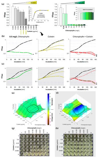 Influence of colistin and chlorophyllin on the growth of Salmonella enterica serovar Typhimurium; (a) Growth status of S. Typhimurium cultures in LB supplemented with different concentrations of colistin (left) and chlorophyllin (right) after 24 h incubation. The outer membrane permeability in the presence of different colistin concentrations was determined by using the 1-N-phenylnaphthylamine (NPN) uptake assay; (b,c) growth pattern of S. Typhimurium in the presence of 0.5 mg/L chlorophyllin (green line, first column), colistin (yellow lines, central column) and of a combination of both compounds (red lines, right column). The black lines describe growth in LB without any supplementation; (b) cells were illuminated with a light intensity of 12 mW/cm2; (c) cells were incubated in dark. In columns two and three, dotted lines describe the growth pattern of cultures in LB + 0.10 µg/mL colistin, dashed lines growth pattern of cultures in LB + 0.25 µg/mL colistin, and solid lines growth pattern of cultures in LB + 0.5 µg/mL colistin. Depicted are measured values (circles) and fitted curves (lines) ± standard deviations (n = 3) showing one representative of three independent experiments. *: p < 0.05 vs. chlorophyllin-free samples; (e,f) Loewe synergism and antagonism for colistin/chlorophyllin combinations against the growth of S. Typhimurium as determined by the Combenefit software (Cancer Research UK, Cambridge, UK). A heat map is used to represent the level of synergy (blue color) at each concentration under (e) illuminated and (f) dark conditions. The area surrounded by dotted line includes the concentration range used for the growth curves. (g,h) Broth microdilution plates for MIC determination for colistin/chlorophyllin combinations under (g) illuminated and (h) dark conditions.