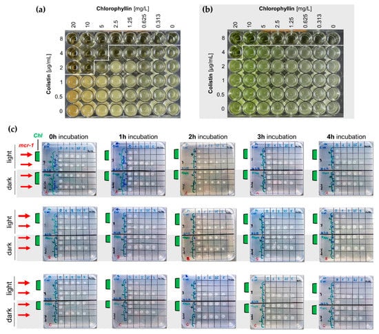 (a,b) Broth microdilution plates for MIC determination for colistin/chlorophyllin combinations under (a) illuminated and (b) dark conditions; (c) LB agar plates (n = 3) for the evaluation of CFU ability of wild type and mcr-1-positive (red arrows) E. coli after incubation to chlorophyllin-colistin combinations. Liquid cultures of E. coli DH5α were supplemented with 10 mg/L chlorophyllin (Chl, samples with green bars) and different colistin concentrations. Cells grew either illuminated with 12 mW/cm2 or protected from light. Samples (2.5 µL) were drawn at different time points (1 h, 2 h, 3 h, 4 h) and transferred onto LB agar plates. After overnight incubation at 37 °C in the dark, colony growth was analyzed.