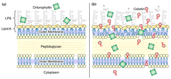 (a) Schematic illustration of the Gram-negative envelope. Chlorophyllin (green squares) is not able to pass the outer membrane; (b) In the presence of colistin (red circles) the outer membrane is disorganized, mainly by colistin’s effect to interact with lipopolysaccharides (LPS). Chlorophyllin can enter the bacterial cell through the disorganized membranes, realizing its antibacterial effect. Parts of the figure were drawn by using pictures from Servier Medical Art, licensed under a Creative Commons Attribution 3.0 Unported License (https://creativecommons.org/licenses/by/3.0/).