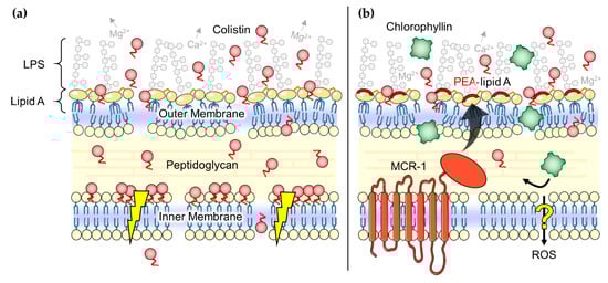(a) Postulated effects of colistin (red circles) on Gram-negative bacteria. Colistin molecules disorganize the outer membrane and may somehow disrupt the physical integrity of the inner membrane (flash symbols) finally leading to cell death [75]; (b) Hypothesized ‘door opener’ effect of colistin for photodynamic treatment with chlorophyllin (green squares). The fatty-acyl tail is still able to perturb the outer membrane but effects on the inner membrane seems to be impaired by the protein MCR-1. Our data suggests that MCR-1 inhibits the uptake of chlorophyllin over the inner membrane (no inactivation of bacteria in the dark) but might allow the passing of chlorophyllin’s photodegradation products such as ROS (inactivation in light). LPS: lipopolysaccharides, PEA: phosphoethanolamine, ROS: reactive oxygen species. Parts of the figure were drawn by using pictures from Servier Medical Art, licensed under a Creative Commons Attribution 3.0 Unported License (https://creativecommons.org/licenses/by/3.0/).
