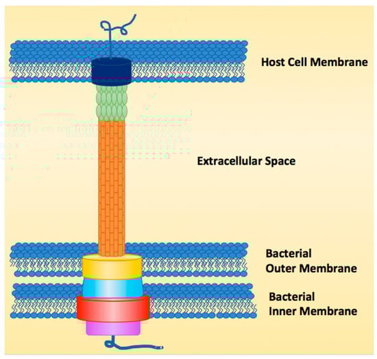 The T3SS functions like a molecular syringe by injecting or secreting effector proteins directly from the cytosol of the bacterial pathogen through the host cell membrane, earning it the nickname “the type III injectosome” [,,,,,]. The structure of the injectosome can be broken down into three major regions, the sorting platform, the basal body and the needle (Figure 1). The sorting platform, which is within the cytoplasmic region of the bacterial cell, contains an ATPase (purple) to power secretion of linear unfolded proteins, as folded proteins are too wide to go through the ~2.5 nm needle [,]. The ATPase also functions as the recognition domain for effectors and unfolds the effectors for secretion. The basal body (yellow, blue, red) is made of a dual ring system that spans the inner and outer bacterial membranes and anchors the needle to the bacterial cell surface. The needle is composed of helical monomers (orange) that form a tube-like structure after polymerization []. The needle differs in length from species to strain depending on the host that the pathogen has evolved to infect []. The tip of the needle (green) also varies in length from one species to another. In E. coli, for instance, the needle tip is longer than the needle itself, which is not the case for other T3SSs []. The final structural component to the injectosome is the pore (dark blue) that is formed in the host cell membrane, made up of two pore-forming proteins that allow effectors to pass into the host (for E. coli, EspB and D) [,,,].
