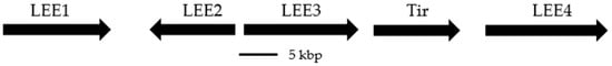 The T3SS and its components are typically encoded in pathogenicity islands (e.g., Salmonella pathogenicity islands, SPIs [,,]); however, in the case of Yersinia species, the genes for the T3SS can also be found on a ~70 kbp virulence plasmid [,]. The ~35 kbp pathogenicity island that encodes the T3SS in E. coli is referred to as the locus of enterocyte effacement (LEE) [,,,], and encodes 41 different genes under the control of 5 promoter regions (LEE1–LEE4 and Tir, Figure 2). The T3SS is not constitutively active, and expression is tightly controlled by environmental signaling factors [,,,,].