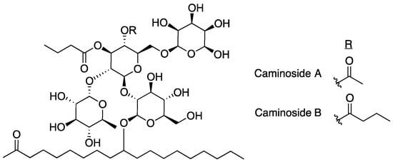 - Linington, R.G.; Robertson, M.; Gauthier, A.; Finlay, B.B.; Van Soest, R.; Andersen, R.J. Caminoside A, an antimicrobial glycolipid isolated from the marine sponge Caminus sphaeroconia. Org. Lett. 2002, 4, 4089–4092. [Google Scholar] [CrossRef]