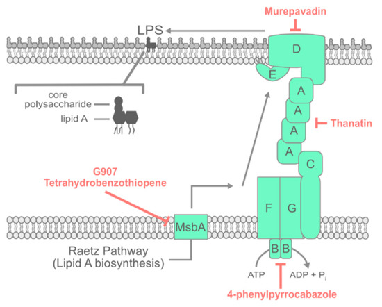 In order to fulfill its function in the OM, LPS must be synthesized and transported across the aqueous periplasm. The lipid A and core saccharide portions of LPS are synthesized at the cytoplasmic leaflet of the IM via the Raetz pathway (Figure 2) [80]; then, the molecules are translocated to the periplasmic leaflet of the bilayer by the flippase MsbA (Figure 2) [81,82]. Recently, two compounds that are active against MsbA were reported. A quinoline compound, G907, is an optimized and potent inhibitor of E. coli MsbA in vitro [83]. G907 prevents the ATPase activity of MsbA by binding the transmembrane pocket of the MsbA homodimer to lock the protein in a cytosol-facing LPS-bound state [83]. The combined effect is a potent inhibition of LPS flipping. G907 is active against E. coli and K. pneumoniae but shows reduced efficacy against P. aeruginosa [83].
