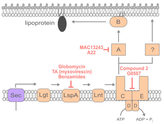Only fully mature, triacylated lipoproteins can be trafficked to the OM; thus, one possible strategy to prevent lipoprotein trafficking is the inhibition of lipoprotein maturation in the IM. Multiple inhibitors of LspA have been characterized [113,114]. By preventing the cleavage of the signal sequence, LspA inhibitors trap lipoproteins in the IM. In addition to preventing essential lipoproteins from reaching the OM, the mislocalization of some OM-targeted lipoproteins, such as Lpp in E. coli [115], has toxic consequences.