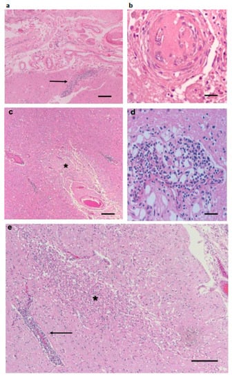 Representative pathological images of CNS. (a) A section through the frontal leptomeninges shows meningeal thickening and chronic inflammatory infiltrates. There is an infiltrate surrounding a penetrating vessel (arrow). (b) A leptomeningeal vessel that has been occluded, showing small zones of recanalization. (c) Deep frontal white matter contains infarcts, one illustrated here (*). (d) A blood vessel in the frontal deep white matter shows a mixture of lymphocytes and plasma cells. (e) An infarct in the frontal cortex (*) near a blood vessel with a chronic inflammatory infiltrate (arrow). All sections stained with H&E. Scale bars: (a) 100 μm, (b) 25 μm, (c) 100 μm, (d) 25 μm, and (e) 200 μm.