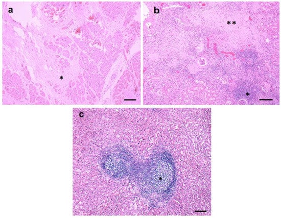 Representative pathological images of the kidney. All sections stained with standard H&E histological stains. (a) A section of the left ventricle with extensive fibrous scarring (*). Scale bar: 200 μm. (b) A section of kidney shows inflammatory infiltrates (*) scattered among glomeruli and tubules and areas of fibrous scarring (**). Scale bar: 100 μm. (c) A section of liver with inflammation in the portal zone (*). Scale bar: 100 μm.