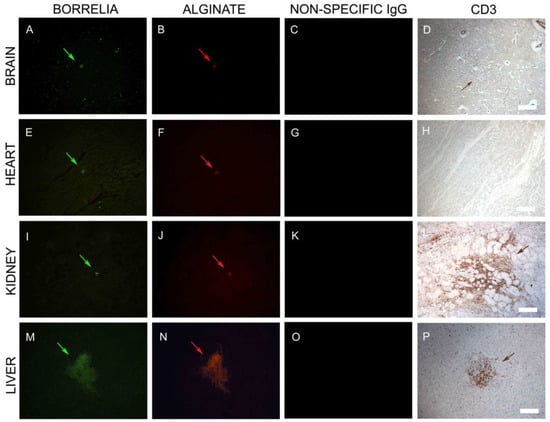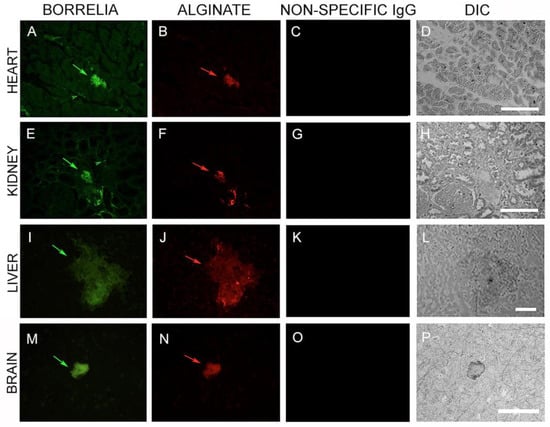 Representative images of IHC staining of autopsy tissues (heart, kidney, liver, brain) with Borrelia- and alginate-specific antibodies. Aggregates stained positive with Borrelia- (green staining: A,E,I,M) and alginate-specific antibodies (red staining: B,F,J,N) respectively. A nonspecific IgG antibody was used as an additional negative control for the primary antibodies using the sequential tissue section (C,G,K,O). Differential interference microscopy (DIC) showing the size and tissue morphology (D,H,L,P). Scale bar: 200 μm.
