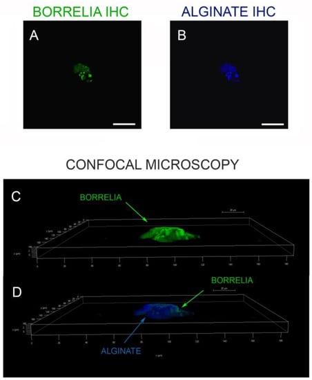 The tissue sections were first immunostained for Borrelia and alginate, as described above, and further analyzed with a confocal scanning laser microscope (Leica DMI6000). ImageJ software (Imagej.nih.gov, https://imagej.nih.gov/ij/index.html was used to process the obtained z stacks to provide a detailed analysis of the spatial distribution of the different antigens (Plugins: Interactive 3D Surface Plot and Volume Viewer).