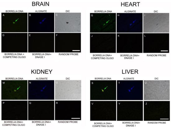 Representative images of presence of Borrelia biofilm DNA using fluorescent in situ hybridization (FISH) combined with alginate IHC in brain, heart, kidney, and liver autopsy tissues. The FISH results showed positive staining for Borrelia DNA in all four organs (A,G,M,S; green arrow) using Borrelia-specific 16S rDNA probes. The Borrelia-positive aggregates, but not the spirochetes (G: small green arrowhead), are also stained with alginate antibody (B,H,N,T; blue staining). Differential interference contrast (DIC) microscopy (C,I,O,U) was used to visualize the morphology of the biofilm structure and the surrounding tissue. For negative controls of all FISH experiments, competing oligonucleotide probes (D,J,P,V), DNase I-treated samples (E,K,Q,Y), and a random oligonucleotide probe (F,L,R,Z), were used to test the specificity of the 16S rDNA probes. Scale bars: 200 μm.