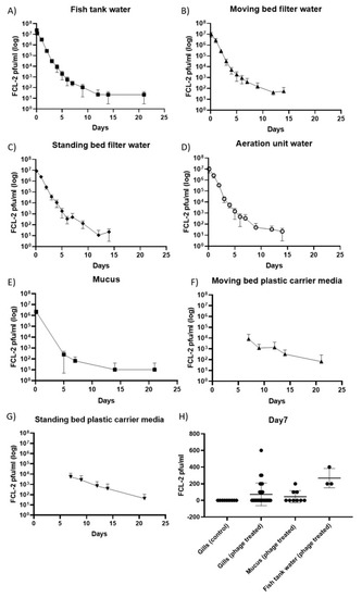 Phage persistence over time in the recirculating aquaculture system (RAS) tanks and fish. Phage FCL-2 titers (pfu/mL) on (A) the fish tank water, (B) the moving bed water, (C) the fixed-bed water, (D) the aeration unit water, (E) fish mucus, (F) the moving bed plastic carrier media, (G) the fixed-bed plastic carrier media, (H) on fish gills (seven days after phage exposure). In A, B, C, and D, each tank was sampled once until day seven and in triplicates from day nine onwards. In E, three fish per tank were sampled in the first and fifth day, then three fish per control tank, and ten fish per phage-treated tank were measured from day seven onwards. In F and G, five carrier media pieces per tank were sampled in all time points. In H, three fish from each control tank and ten fish from each phage treated tank were measured.