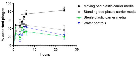 Adsorption of phage to plastic carrier media. Each condition was tested in triplicates. Unpaired t-tests were used for comparing the controls and tested conditions. * Statistical difference found (exact p values are mentioned in the text).