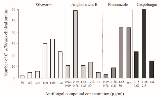 Furthermore, the effectiveness of silymarin against the clinical isolates of C. albicans was confirmed. The study was performed on 100 strains, which were isolated from the vaginas of gynecological patients. Silymarin showed efficacy against 77 tested clinical isolates with MIC in the range of 30–1200 µg/mL, while 23 isolates were not affected in the tested range of concentrations. Complete inhibition of cell growth for most strains occurred at the high concentrations of silymarin, namely at 600 µg/mL (30 isolates) and 1200 µg/mL (34 isolates). The MIC values for the reference antibiotics (i.e., amphotericin B, fluconazole, and caspofungin) ranged from 0.02 to 50 µg/mL, from 0.19 to 50 µg/mL, and from 0.15 to 2.5 µg/mL, respectively (Figure 1). The highest number of strains was inhibited by amphotericin in the concentration range of 0.19–0.78 µg/mL and by caspofungin in the concentration range of 1.25–2.5 µg/mL. Fluconazole was the most effective at concentrations from 12.5 to 50 µg/mL. Among the tested compounds, the highest percentage of resistant strains was found for fluconazole at the concentration range used.