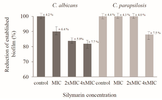 Influence of silymarin on established biofilms of C. albicans and C. parapsilosis.