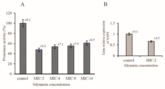 Effect of silymarin on proteinase activity (A) and on the relative expression of SAP4 by qRT-PCR (B). Level of gene expression displayed after normalization with the internal control housekeeping gene ACT1.
