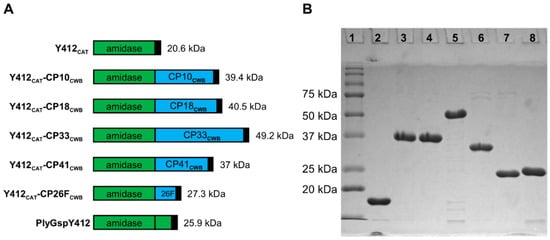 PlyGspY412 derived recombinant lysins schematics and SDS-PAGE. (A) Schematics: PlyGspY412 supplied the N-terminal CAT domain (green), Y412CAT. C-terminal CWB domains (blue) were derived from one of five C. perfringens endolysins (PlyCP10, PlyCP18, PlyCP33, PlyCP41, PlyCP26F). Black box indicates the C-terminal 6 x His domain. Each recombinant protein has a C-terminal LEHHHHHH to facilitate purification by nickel-affinity chromatography; those with CP18CWB have VEHHHHHH (as described in Supplementary Data). (B) SDS-PAGE of Y412CAT fusion proteins purified by nickel chromatography. Lane 1 is Precision Plus Protein standard (Bio-Rad). The other lanes are as follows: lane 2, Y412CAT; lane 3, Y412CAT-CP10CWB; lane 4, Y412CAT-CP18CWB; lane5, Y412CAT-CP33CWB; lane 6, Y412CAT-CP41CWB; lane 7, Y412CAT-CP26FCWB; lane 8, PlyGspY412.