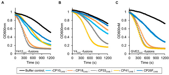 Testing of the PlyGspY4 derived CAT domain, Y4CAT, and its fusion proteins was done by standard turbidity reduction assay. As seen in Figure 6B, lytic activity was as follows (highest to lowest): Y4CAT-CP41CWB > Y4CAT-CP33CWB > Y4CAT-CP10CWB > Y4CAT-CP18CWB. Y4CAT-CP26FCWB was inactive against Cp39 cells, as seen by its line adjacent to the buffer control line at the top of the plot in Figure 6B. Interestingly, Y4CAT-CP41CWB appears to be more active compared to the other Y4CAT-fusions, whereas the Y412CAT-CP41CWB fusion falls into the middle of the Y412CAT-fusions in terms of activity in this assay. PlyGspY4 and Y4CAT were inactive against Cp39 cells (see Supplementary Figure S2, Table S1).