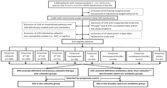 Flowchart of patient selections. * Indicate the time to appropriate antibiotic of >24 h. ** Included 235 patients with third-GCs, 154 with second-GCs, 24 with carbapenems, 60 with FQs, 30 with fourth-GCs, 21 with ampicillin/sulbactam, 13 with piperacillin/tazobactam, 3 with piperacillin, and 2 with others. ED = emergency department; GC = generation cephalosporin; FQ = fluoroquinolone; BLI = β-lactamase inhibitor.